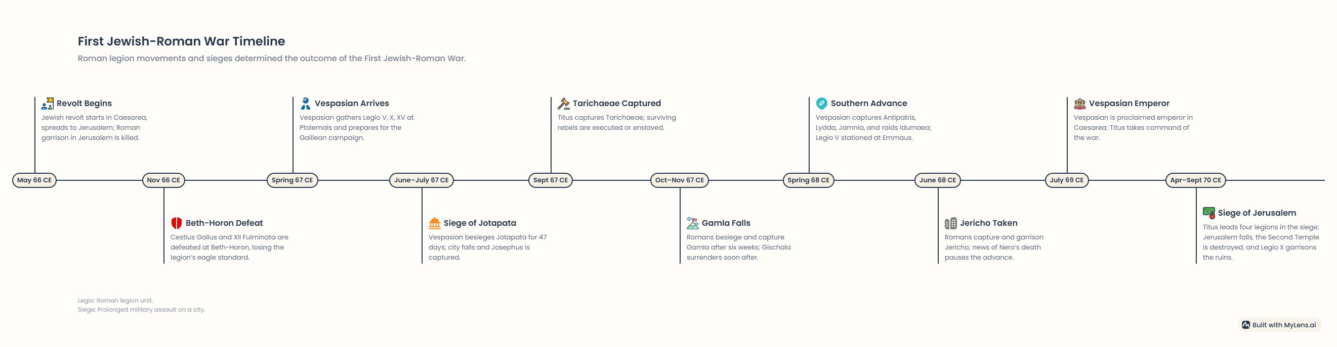 This timeline outlines the movements of Roman legions — primarily Legio V Macedonica, X Fretensis, XV Apollinaris, and the ill-fated XII Fulminata — during the First Jewish-Roman War (66 – 70 CE) based on the account of Flavius Josephus. 1, 2.